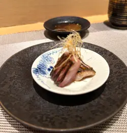 吃口薄切鰈魚卷內藏了海膽, 口感鮮甜豐富, 沾些柚子皮汁, 非常可口.   另有薄切鰈魚燒了魚邊, 又卷著芽蔥, 品嚐了多種口味.  一吃愛上.