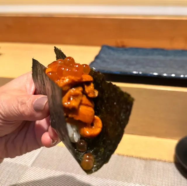 北海道海膽色澤金黃,  系我們最愛, 入口即溶,   濃濃 鮮甜的海膽味,  確實令人回味無窮.  加上巨型三文魚籽, 爆汁的感覺, 吃得極之陶醉啊!