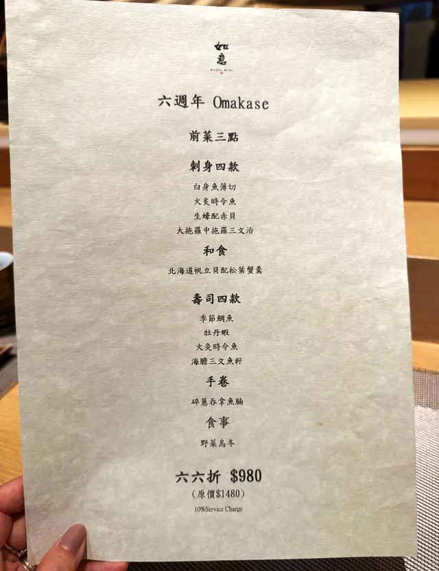 適逢餐廳正慶祝六週年紀念, 晚市 Omakase - 優惠有 66 折 (原價$1480) 現正 $980/P.