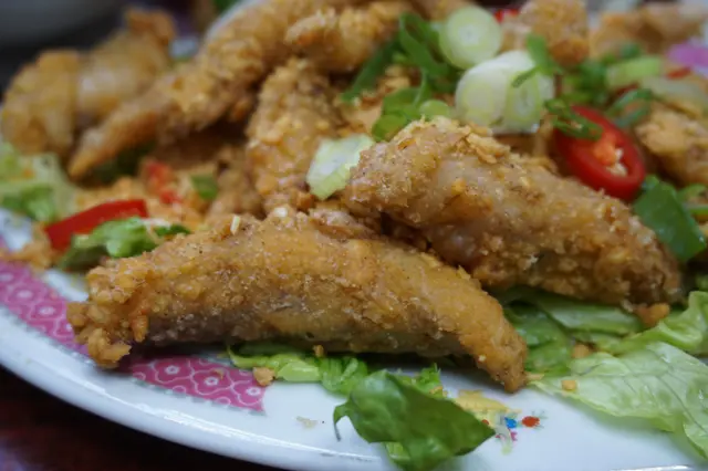 姍姍來遲的椒鹽九肚魚($80),換來是更金黃香脆的食感,甘香酥膩伴隨嫩滑的九肚魚,再沾上滿滿的炸椒蒜粒,跟滷水鵝片同樣推介。