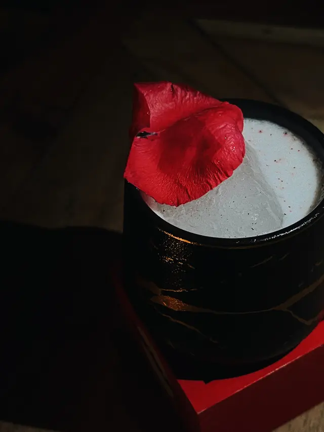一上枱已經係打卡之選,酒杯用乾冰襯托送上,上面有玫瑰花碎裝飾 視覺效果滿分 Gin酒配上梨汁帶點fruity 再用清酒 薰衣草和雪糕 打成奶泡 係一杯易入口又清新既cocktail