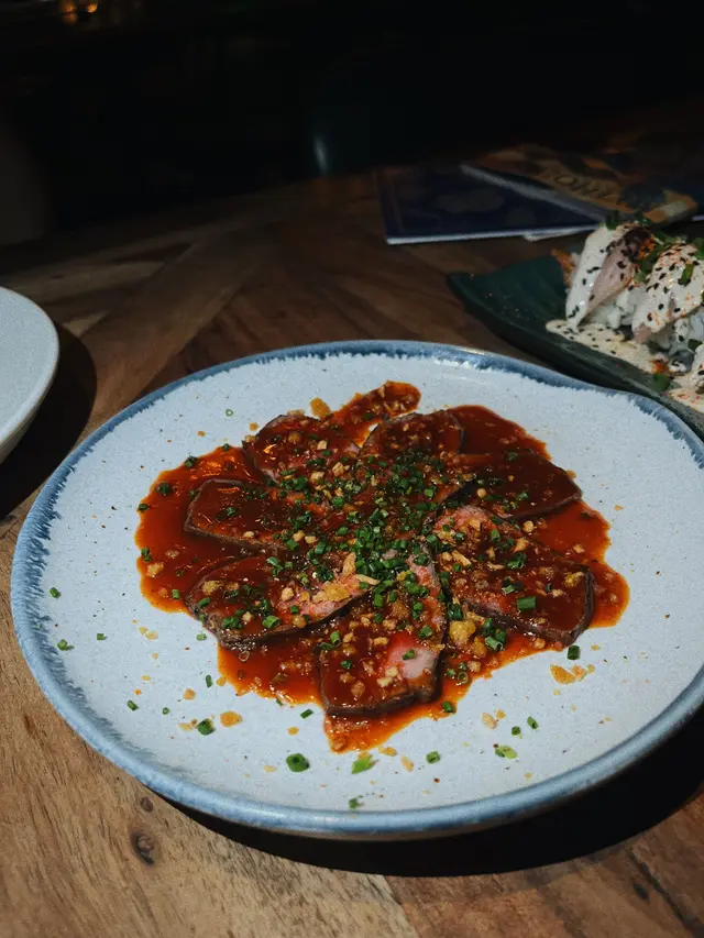 炙燒而成嘅西冷薄切牛肉片呈現半生熟嘅狀態 以醃茄製成嘅惹味醬汁覆蓋住每塊牛肉片 再拌上蒜粒及䓤粒 肉質柔軟 而醬汁味道有啲似燒烤醬 相當入味