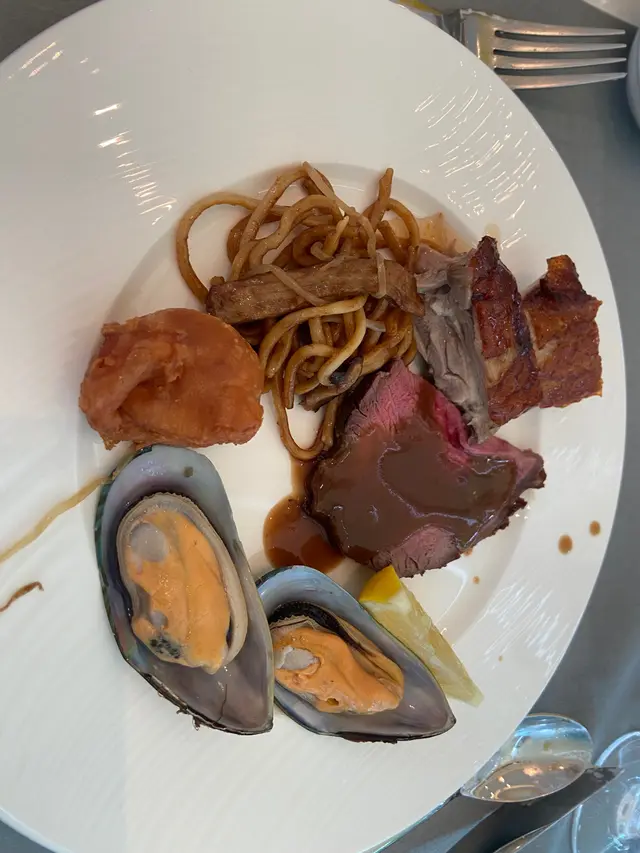 一直都覺得呢度負評比較多,都唔想嚟試,今次買一送一就嚟試吓啦。呢度環境舒適🥰,枱唔知係咪換咗啊係雲石枱冇污跡。地方闊落空間感不錯,環境都舒適,個個客人都好斯文,員工服務都幾好,都好helpful😊。食物都唔錯吖,壽司好食、燒牛肉好食、即煮意粉好食、南乳炸雞好食、三文魚好食、甜品款式以午餐嚟講都多,味道一啲都唔差。雪糕佢係會出嚟派嘅、你再食可以問佢再攞。飲品就有果汁自取,之後仲包一杯咖啡奶茶,你order 去攞俾你。佢亦都會主動叫你 order🫶🏻,因為我唔知道有。