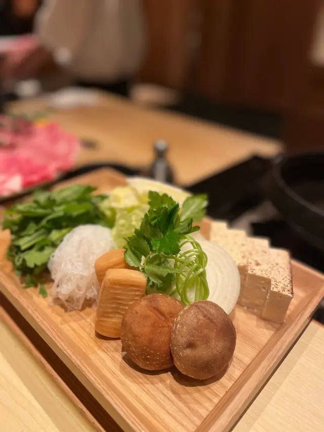蔬菜有娃娃菜、冬菇、皇帝菜、豆腐、麵筋、春雨等。落的壽喜燒汁唔會太多,煮菜都唔會太鹹☺️ 最鍾意豆腐洋蔥春雨,呢幾種都特別甜。