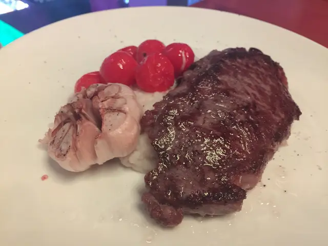 再有另一必食主菜燒安格斯肉眼扒配紅酒燒汁。肉眼扒肉質夠嫩,入口口感細膩,連同血紅色的紅酒燒汁,帶出微微的酸香;配菜薯蓉亦相當幼滑,配以原個燒蒜頭,整體配搭非常特別,滿分。