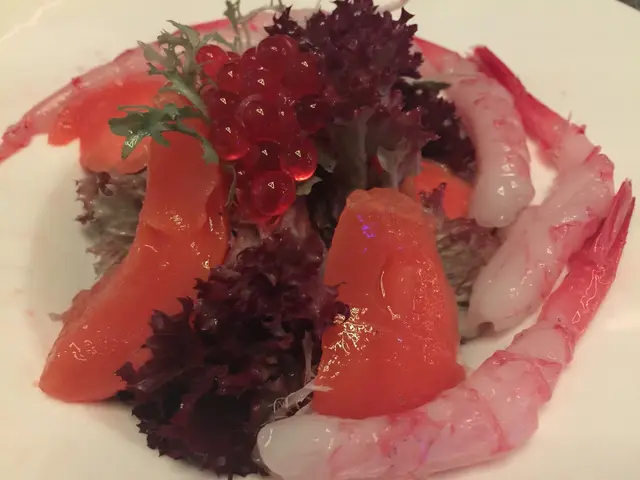 頭盤先有芒果甜蝦沙律。份量不算多,但勝在夠精緻。沙律菜配上深色香甜的芒果肉和大大粒三文魚籽,兩者混集起來味道原來十分匹配,甜蝦味道亦鮮甜味美。