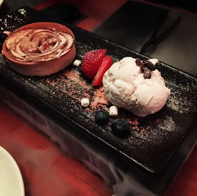 最後點了一客蘋果金寶,玫瑰形狀的蘋果金寶即點即焗,伴碟裝飾做足之餘,上枱時還有乾冰的效果!外皮很香脆鬆化,甜酸度剛好,亦食到一片片的蘋果肉。Detail位做到足,值得表揚!