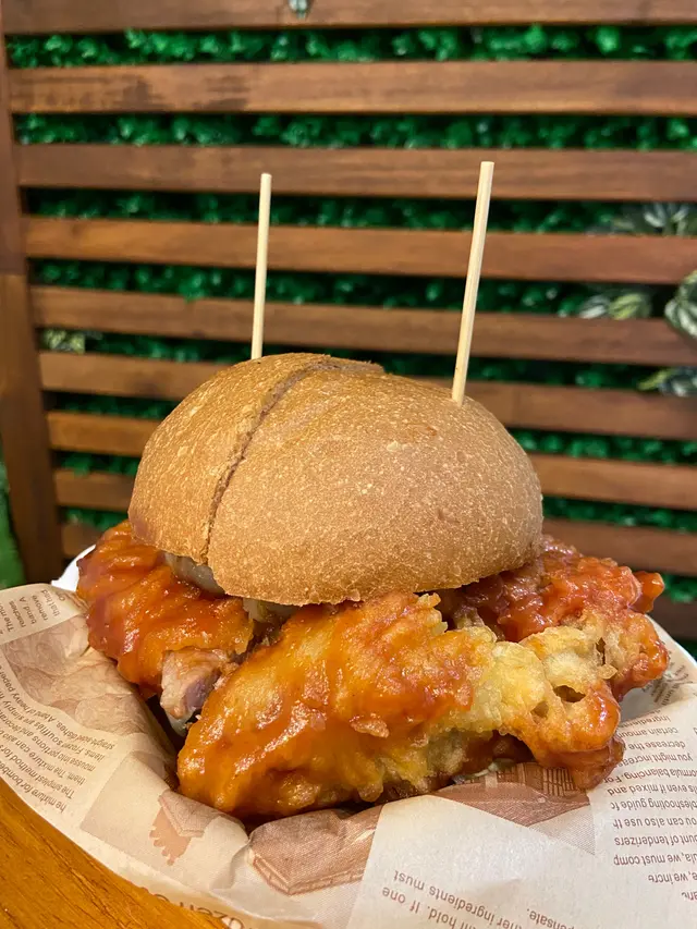 一睇menu就比佢既特色漢堡深深吸引,同傳統漢堡包店唔同,佢推出港式漢堡,包括西檸雞漢堡、咕嚕肉漢堡等等,今次我就揀咗咕嚕肉漢堡。塊肉咬落去好林好入味,醬汁酸酸甜甜,塊咕嚕肉大過我隻手掌呀。廚師好細心地將漢堡包切開兩半,方便進食。