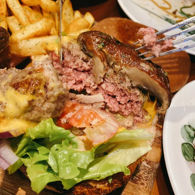 超巨型漢堡,一上枱已經「哇」左一聲出黎,擺盤靚爆之餘,味道真係冇得彈。首先係個包烘得恰到好處,外脆內鬆軟,面頭已經一塊大啡菇趴左晌度等人魚肉,一切開啲汁係即時「標」出黎,juicy到一個點。牛肉切開後係見到粉紅色,又香又嫩,正到暈,配搭芝士、洋蔥,一齊放落口既時候簡直幸福感MAX。薯條方面就係即炸薯條,熱辣辣,又粗又大條,好香好好食,整體性價比極高。