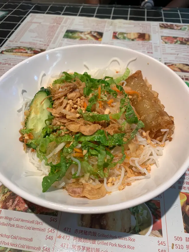 是次周末到深水埗逛逛,與友人到汝州街買珠仔,然後去排長龍冷肉店,足足邊站邊等了個半小時,(地膽應該知我講邊間)買完之後已經餓腸轆轆,就決定到西九龍中心醫醫肚喇。入到去才知道原來越老仔是銀杏館旗下的社企餐廳,一入到去長者員工就熱情招待我們,提醒有自助飲品區,可自行添飲。是次點了越南春卷撈檬,通常會另上酸辣汁,但這兒的是一早預放在餐桌上。茶餐的撈檬只有一條春卷,是有點兒失望,但春卷還算是新鮮炸起,鬆脆可口,內裡是豬肉及粉絲;而酸辣汁其實比坊間的越南餐廳偏咸了一點,我本人較喜歡酸酸甜甜的味道。食物整體上不過不失,而提供的飲品是自家煲的菊花茶,夠晒健康,有家的味道。社企餐廳還是要多多支持的!