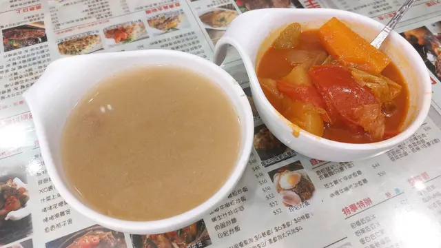 例湯先上,“涼瓜黃豆煲排骨”和“羅宋湯”,沒什麼味精,足料,都可以。