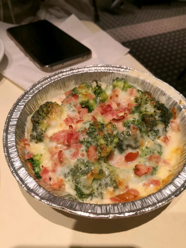 煙肉忌廉焗西蘭花,忌廉好多足夠包住所有西蘭花,煙肉碎配上味道好夾。
