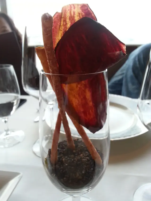 坐下來先有兩份以玻璃杯載著的幾條幼身脆麵包條和兩片薯片,看來更似是一件藝術品。