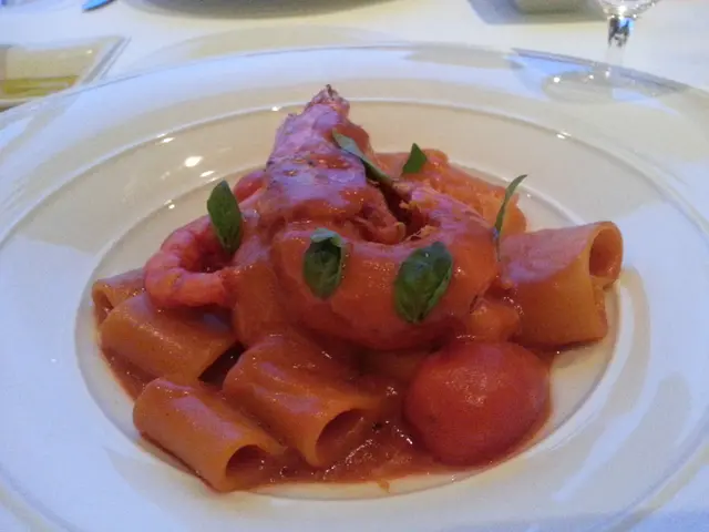 我order的main course是紅蝦配闊桶麵,有一隻連殼的大紅蝦和幾隻小紅蝦,餐廳經理解釋紅蝦去殼後煮會縮小,於是有一隻連殼煮。紅蝦很爽;醬汁是蕃茄連紅蝦殼一起煮的,食起來紅蝦味比較濃,闊桶麵偏向彈身。