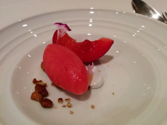 食完main course,送上一份pre-dessert的小食,是一小片布冧,配上布冧做的sorbet,清一清口腔才食dessert。