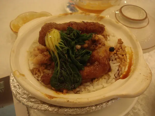 先食傳統茶樓早餐必食的盅頭飯. 這裡的份量是小的, mini版. 細細份的鳳爪排骨飯. 鳳爪兩隻, 味道未算最美, 排骨未蒸到肉離骨, 還帶點韌, 不過飯是生米蒸飯, 算是可取之物.
