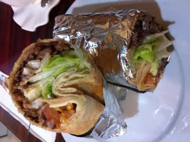 用薄餅卷著羊肉和生菜, 配沙拉醬.
