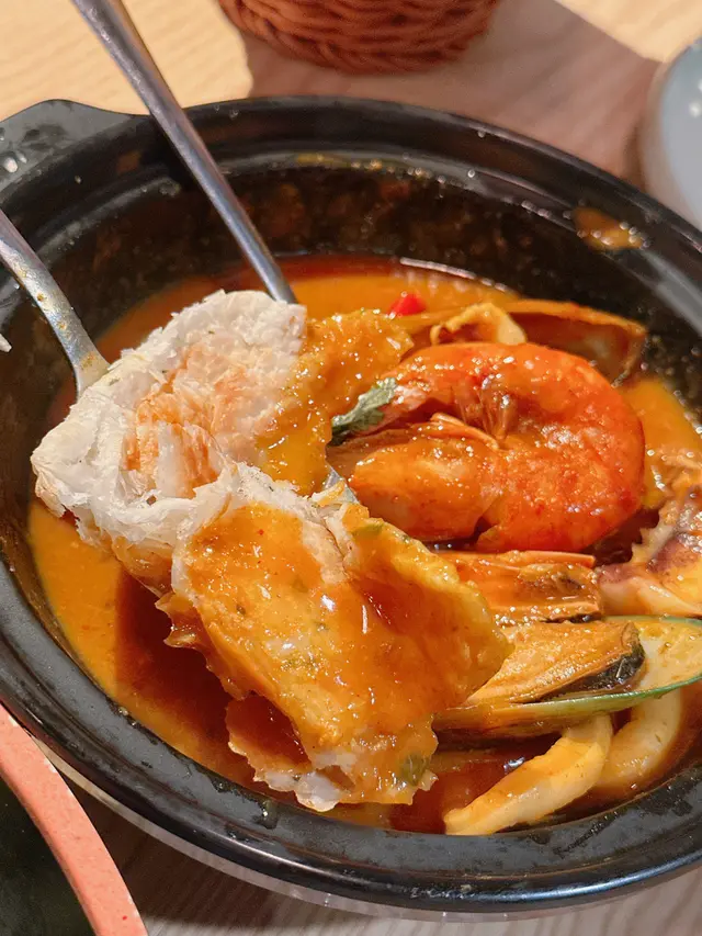 幾款新鮮海鮮有蝦🦐青口🦑魷魚圈及魷魚鬚 非常彈牙鮮味👍🏻黃咖喱重椰奶的味道🌶️帶點香辣好香濃惹味