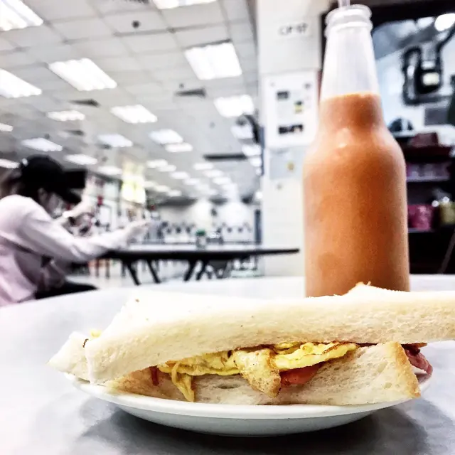 腿蛋治凍奶茶,簡單的組合,上桌時還冒著絲絲蒸氣,半熟炒蛋中間一點點流心蛋白,火腿煎得香脆的黃金邊,恰到好處,就是最美味的腿蛋治