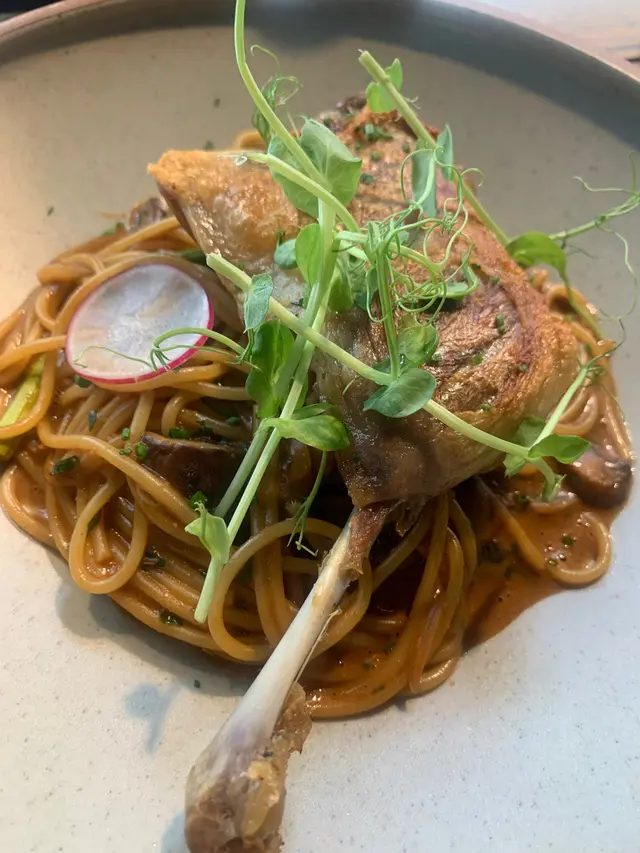 油鴨脾紅酒意大利麵:油鴨脾處理得好並不容易,這裡的油鴨脾不太酥、不油膩、肉質也恰到好處,意大利麵火力剛好,有烟靱口感但不硬,此主食有驚喜。