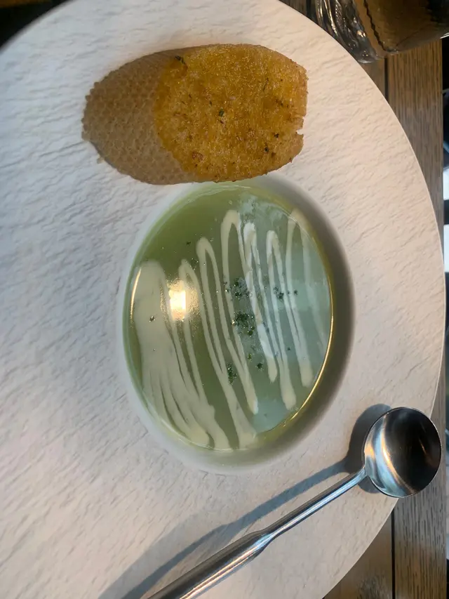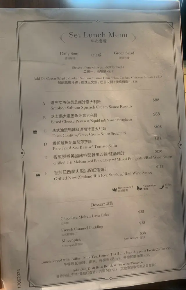 是日是盧筍湯,湯面放上cream, 不但清甜更顯湯品之幼滑,配上焗得十分脆的法包,前奏已能引人入勝。再加一份凱撒沙律,主要成分為牛油生菜(屬較貴價的沙律菜)加上麵包粒和芝士碎,清新、新鮮口感洋溢!