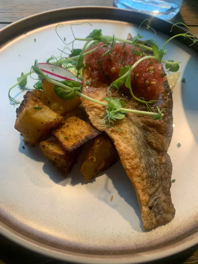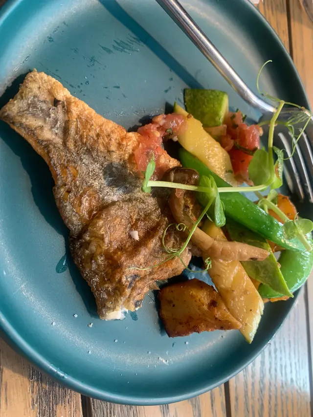 香煎鱸魚配蕃茄沙沙醬:份量雖然不太大,但鱸魚入味不腥,配上炸薯角,及此蕃茄沙沙醬正好取個平衡