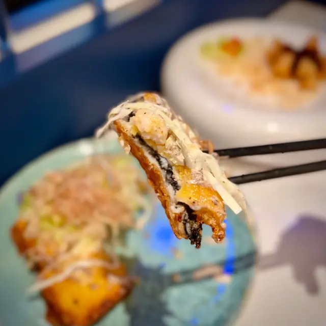 ▶︎ 炸多士包住墨魚漿 上面有蝦 木魚絲同椰菜絲 仲淋咗黑松露醬