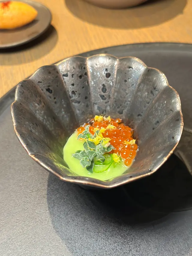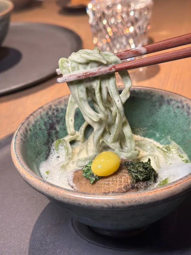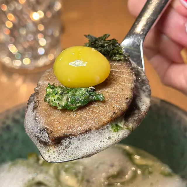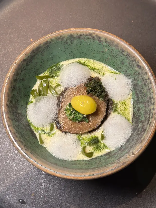 慢煮鮑魚經過精緻的烹調,外層焦香,內裡鮮嫩,口感彈牙,鮑魚肝奶油醬風味獨特為整道菜增添了奢華感,搭配綠茶拉麵、碎扁豆角與脆炸海苔,最後淋上鮑魚肝奶油醬,點綴鮑魚泡沫,並撒上Gikno堅果增添香脆感