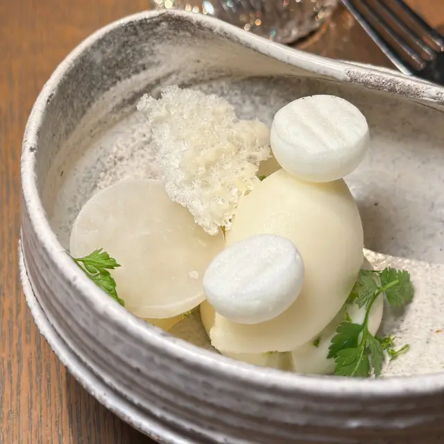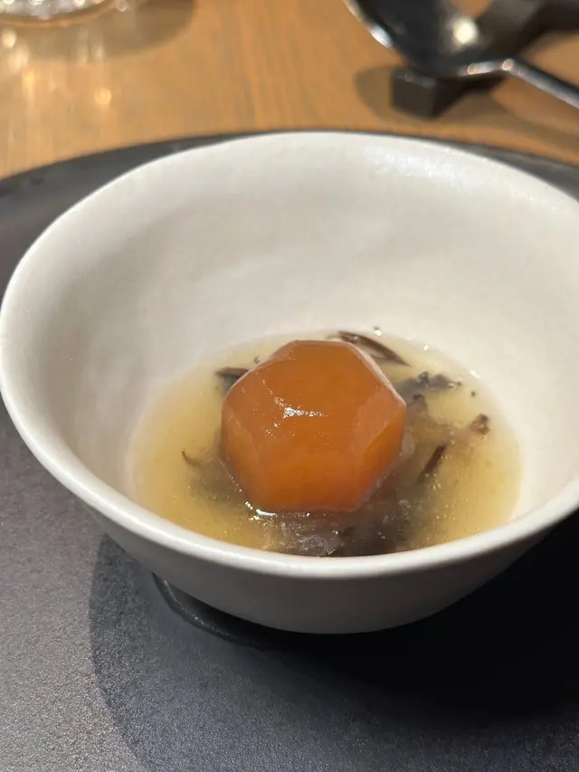 以關東煮風格的高湯為基底,選用鮮嫩的大根芯,經過精緻的烹調,吸收了高湯的鮮美,口感滑順而富有層次,新鮮的木耳增添了脆嫩的口感,與滑順的大根芯形成對比