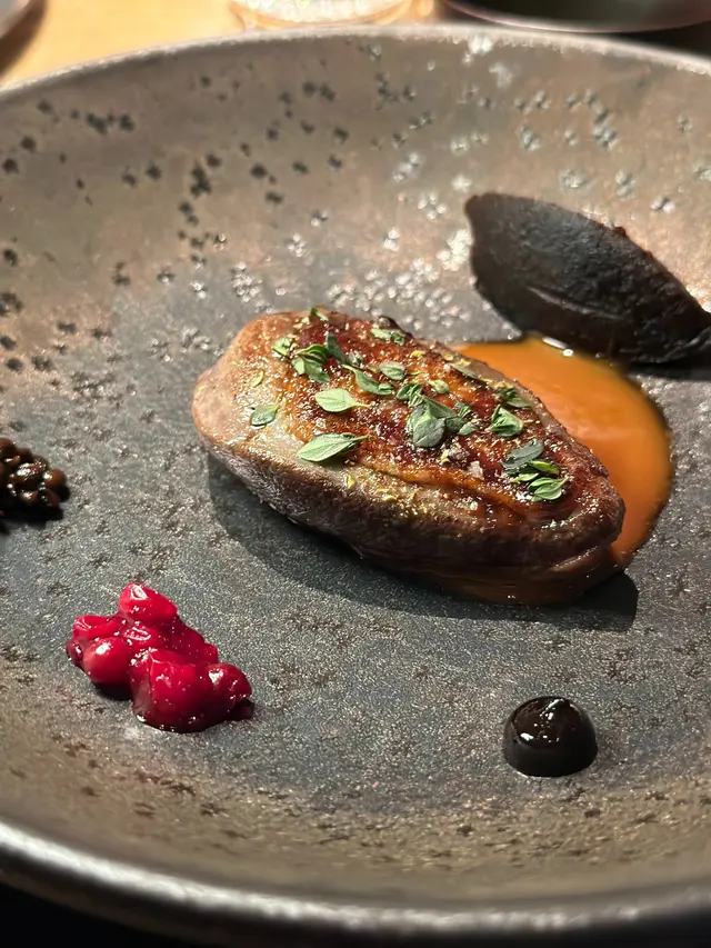 烤乳鴿外脆內嫩,完美的四成熟烹調讓肉質保持多汁,口感極佳。表層的沖繩黑糖脆皮,甜香四溢,為整道菜增添了獨特的風味