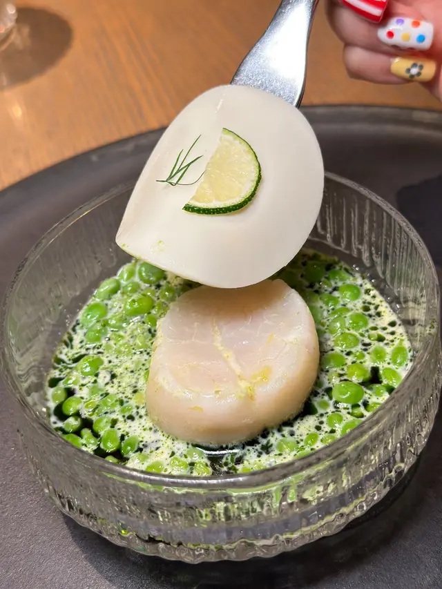 帶子經過味醂和清酒的醃製,外層帶有淡淡的甜味與酒香,內裡依然保持著鮮嫩的口感,青豆的清脆口感與帶子的柔嫩形成絕妙的對比,酪乳醬酸香恰到好處,既能提升帶子的鮮味,最上層的辣根奶油啫喱滑順且帶有微微的辛辣,為整道菜增添了層次感