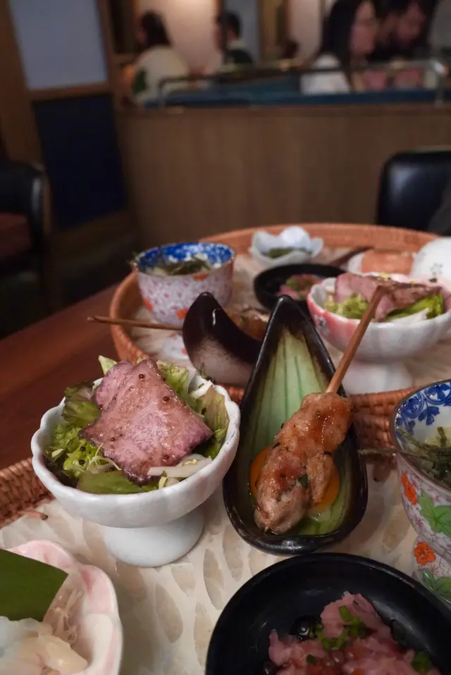 任食時令串燒:有羊肉、雞中翼、雞腿肉、雞頸肉、雞腳筋、豬頸肉、七里香、雞心、翠玉瓜及燒日本番薯仔,串燒質素高,款式選擇都唔少,有基本常見野,少見啲既雞腳筋都有,第一次食,口感幾得意,幾好食。