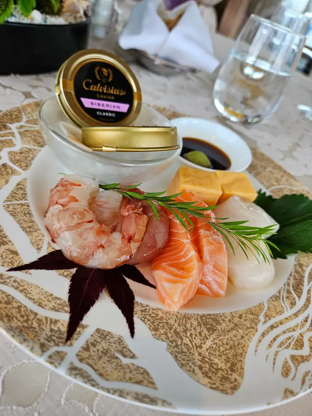 龍蝦湯是絕對值得一試,味道鮮甜。店員還在龍蝦湯上畫了不同的圖案,可見店員的用心和細節。每台還會贈送頭盤(每二位):魚子醬、三文魚帶子及蝦刺身,非常有鮮味。