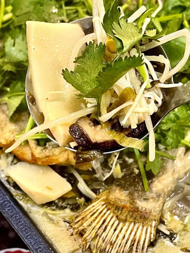 估唔到個份量係咁大,相信四至六人都夠食,條魚勁大條,配料亦好足,魚🐟肉滑溜溜,配上勁多配料,有芋絲、金菇、竹荀、冬菇、芫茜、酸菜、大豆芽、仲有其他配料……….. 等等👍勁👍👍👍👍