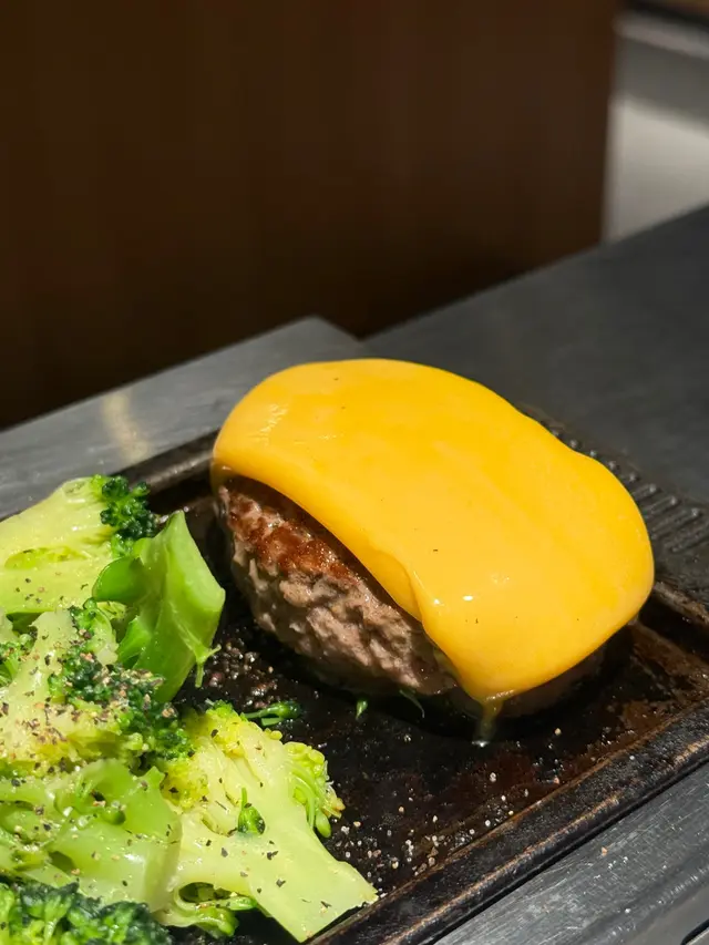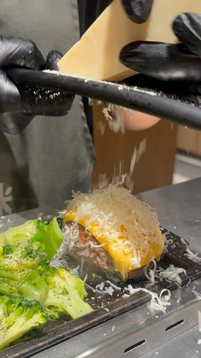 芝士漢堡排:頂層厚切車打芝士被鐵板熱力烤到融化拉絲,一刀切開芝士瀑布,牽絲到一米以外,芝士控會即刻淚崩!