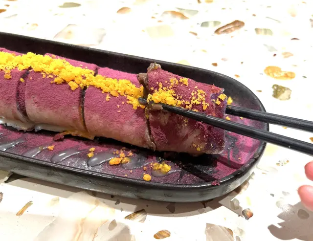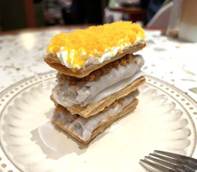 這個甜品頂層鋪滿鹹蛋黃碎加忌廉, 內容豐富有香濃肉鬆, 芋泥和麻糬, 口感綿密. 再夾台式拿破崙酥, 酥香鬆脆, 帶啖啖牛油香, 口感真的不錯.