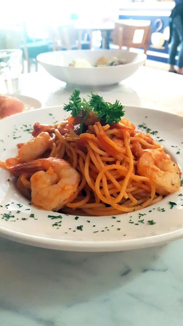 海蝦蕃茄醬意大利粉($75)----意粉爽口彈牙,蕃茄醬香甜又不會酸,掛著每條挺身的意粉,蝦肉都好爽口新鮮,一共有4至5隻蝦肉,份量都好足,令我們食得開胃又滋味。