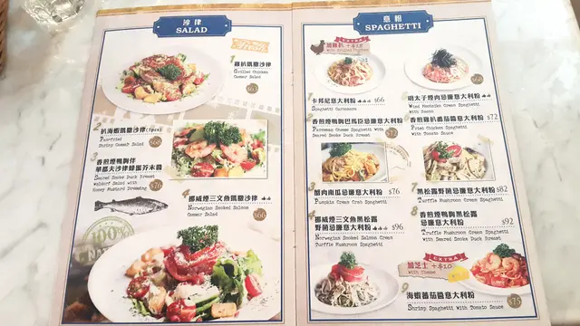 餐牌的外貌都好像一份報紙,不同色彩的照片加上中英文字列名食物名稱,食物方面分別有沙律、小食、意粉、漢堡、牛角包、多士、全日早餐、窩夫及甜點。