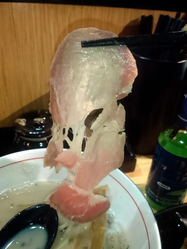 叉燒有薄薄的三片,據悉泡沫拉麵更是自動升級為煙燻玫瑰叉燒;最大分別是煙燻玫瑰叉燒經過長時間的低溫慢煮,基本上和"豚燻"的做法差不多。
