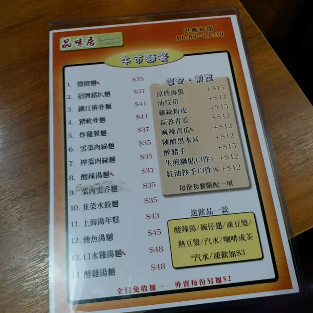 落單時發現餐牌個餐廳名唔同左,連餐飲都變左少少可以揀咖啡奶茶。我叫左酸辣麵凍檸茶,朋友叫左粗炒同熱檸水,再加左個鍋貼。