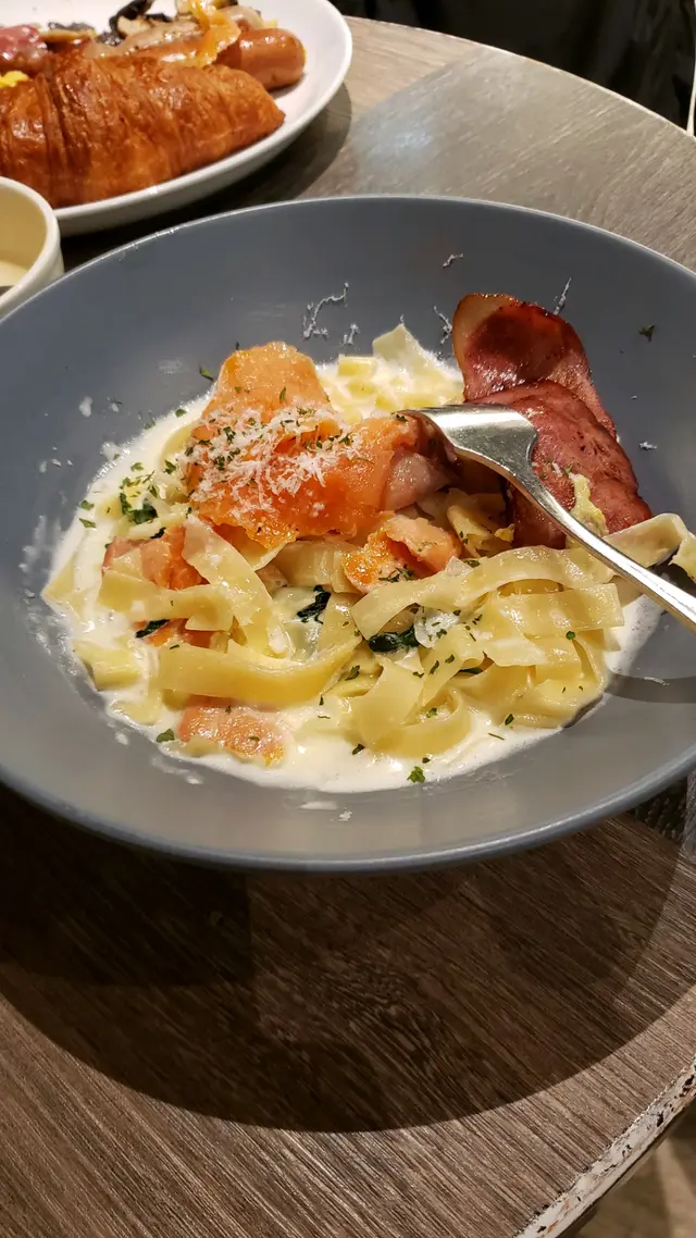 我叫左個三文魚菠菜寬條麵,然後朋友就叫左第一炮🙄但我相信最safe嘅就係佢果炮。