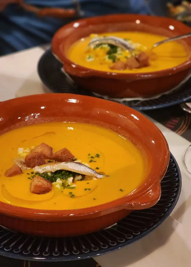 湯質流暢,洋溢著蕃茄、大黃瓜、洋蔥、青椒、蒜香等的清新氣息,味蕾盡是西班牙的仲夏繽紛。而西班牙辣腸和鯷魚,進一步將西班牙凍湯的味道提升,簡宜是大滿足!