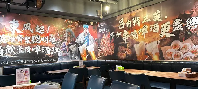 一走到門前,瞬間被濃濃三國風吸引!「呂布戰三英,不如串燒啤酒更盡興」的霸氣壁畫下,藏著老闆對美食的滿滿誠意。每道菜都是心機之作,雖然選擇不多但款款精緻,絕對值得專程到訪!