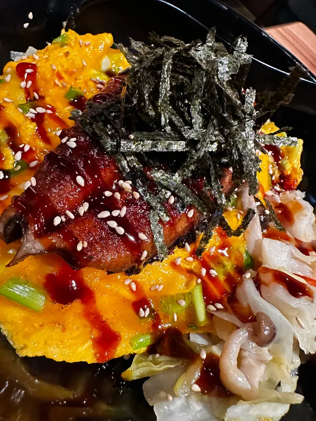 肥厚的鰻魚,醬燒光澤誘人,鰻魚皮烤得微焦帶脆,肉質綿密無骨。滑蛋質地很滑,完美承接蒲燒醬汁。米飯吸收鰻魚油脂與滑蛋,每一口都是享受。