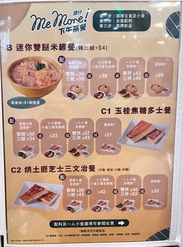 譚仔下午茶 Annie_H等級22024-03-101K 瀏覽 關注 今日3:30pm食第一餐,去咗譚仔食,發現依家譚仔有推出下午茶餐。我地去到譚仔見裡面坐滿人,等咗一陣有2人卡位就坐低食。我地點咗2份迷你雙餸米線餐,另雙拼1人小食,點咗1份迷你紅油木耳同迷你蒜泥白肉。不過迷你雙餸米線唔可以點炸醬,所以我點咗腩肉同豆卜。另外米線只清湯或麻辣湯底可以選擇。下午茶餐都幾抵食,單點迷你雙餸米線配1杯熱飲只需要$35,加拼2份迷你小食都只需$42。除咗米線,下午茶餐仲有多士同三文治餐選擇。以上食評乃用戶個人意見 , 並不代表OpenRice之觀點。讚好分享譚仔下午茶 譚仔雲南米線 (大埔超級城A區) https://s.openrice.com/QrbT0zyBKG0檢舉 張貼 評分4味道4環境3服務3衛生4抵食用餐途徑堂食