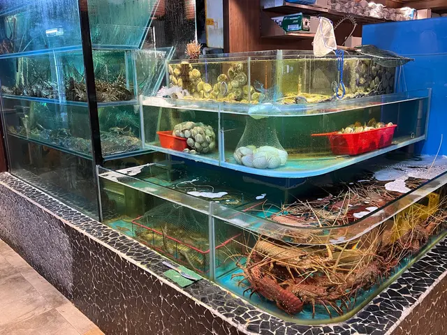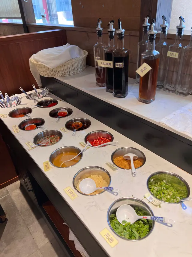 這裡座位很寬敞,幾個海鮮缸裡養著許多生猛海鮮。調料選擇也很多,我調了一個芝麻醬,一個辣椒圈醬油的。