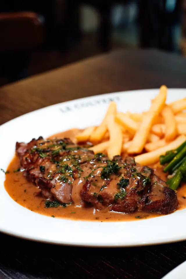 with Le Colvert sauce, duck fat fries & green beans with garlic butter