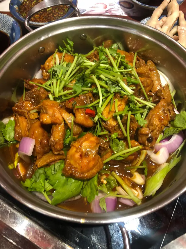 重慶雞鍋~鍋內有大量香茜、洋蔥🧅、姜、紅蔥頭、紅辣椒🌶️⋯⋯等配料,混合雞件在鍋中略炒即可,非常惹味。