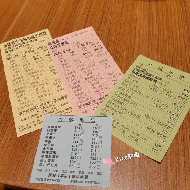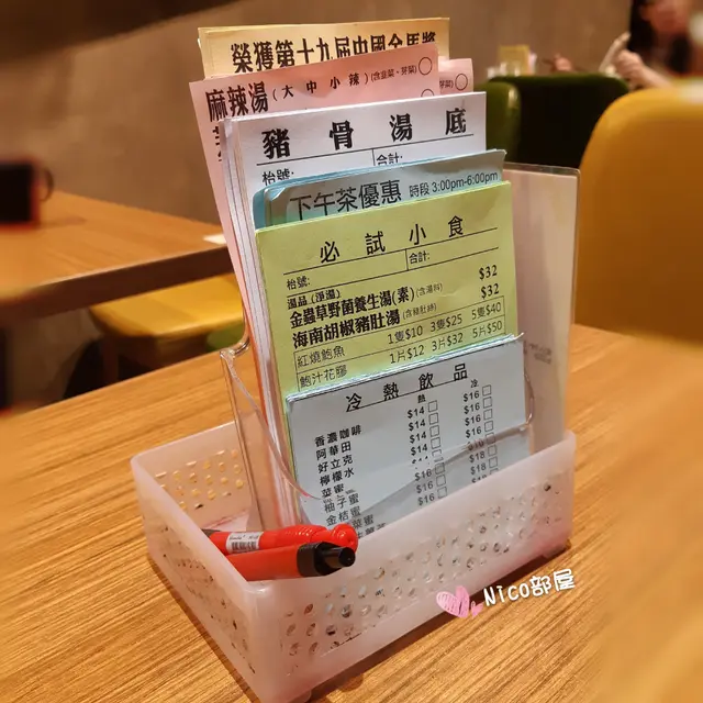 枱上放有點菜紙,不同顏色,除車仔麵外,還有大碗飯、小食、各式飲品。