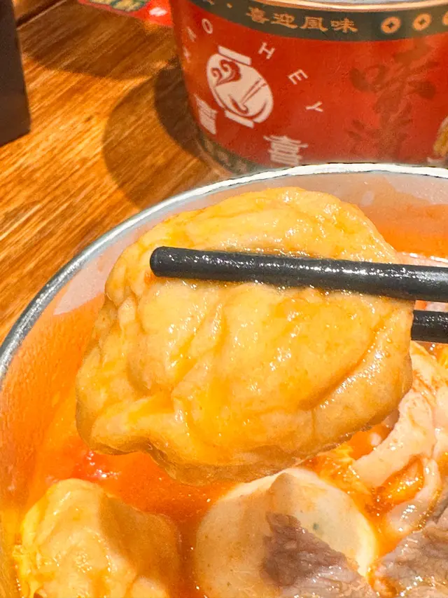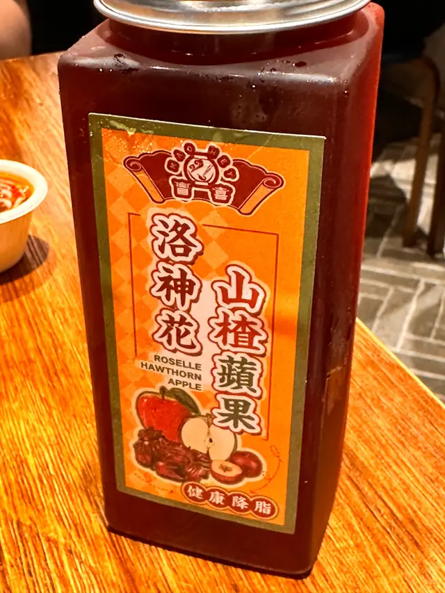「洛神花山楂烏龍茶」以天然洛神花酸香為基底,加入山楂蘋果增添果香,冰鎮後清爽解辣。#潮汕手打丸 #番茄湯底專家